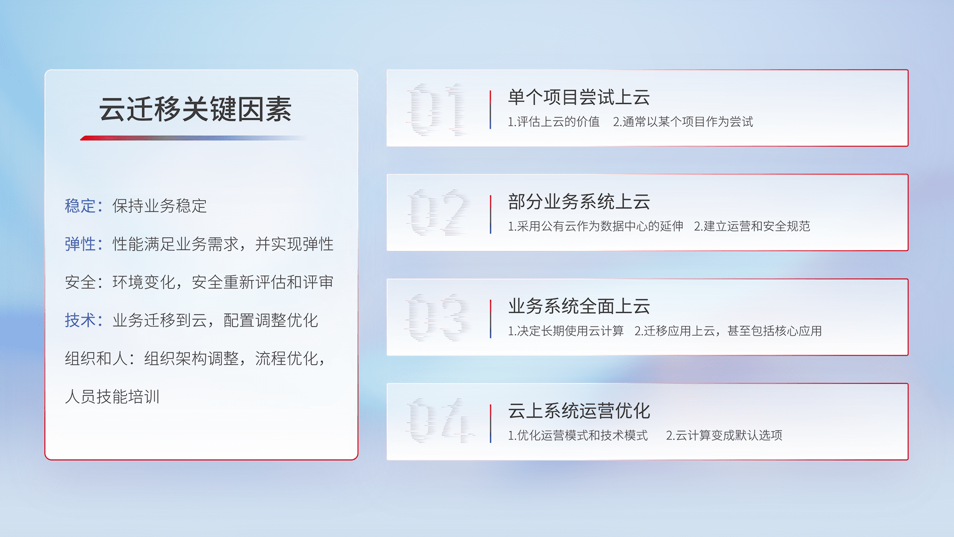 结合实际业务,,,,从规划设计、、、云平台选型、、、、云原生改造、、、、数据迁移、、集成交付,,,迁移全过程为客户识别最佳上云路径,,做好风险识别管理,,,,设计网络架构、、身份权限、、、安全审计合规、、操作审计、、日志审计、、、监控告警策略、、、、多站点容灾设计等,,,,对云上基础设施进行整体规划,,提升IT治理水平,,以满足弹性、、、高可用、、、、高性能的需求。。。。